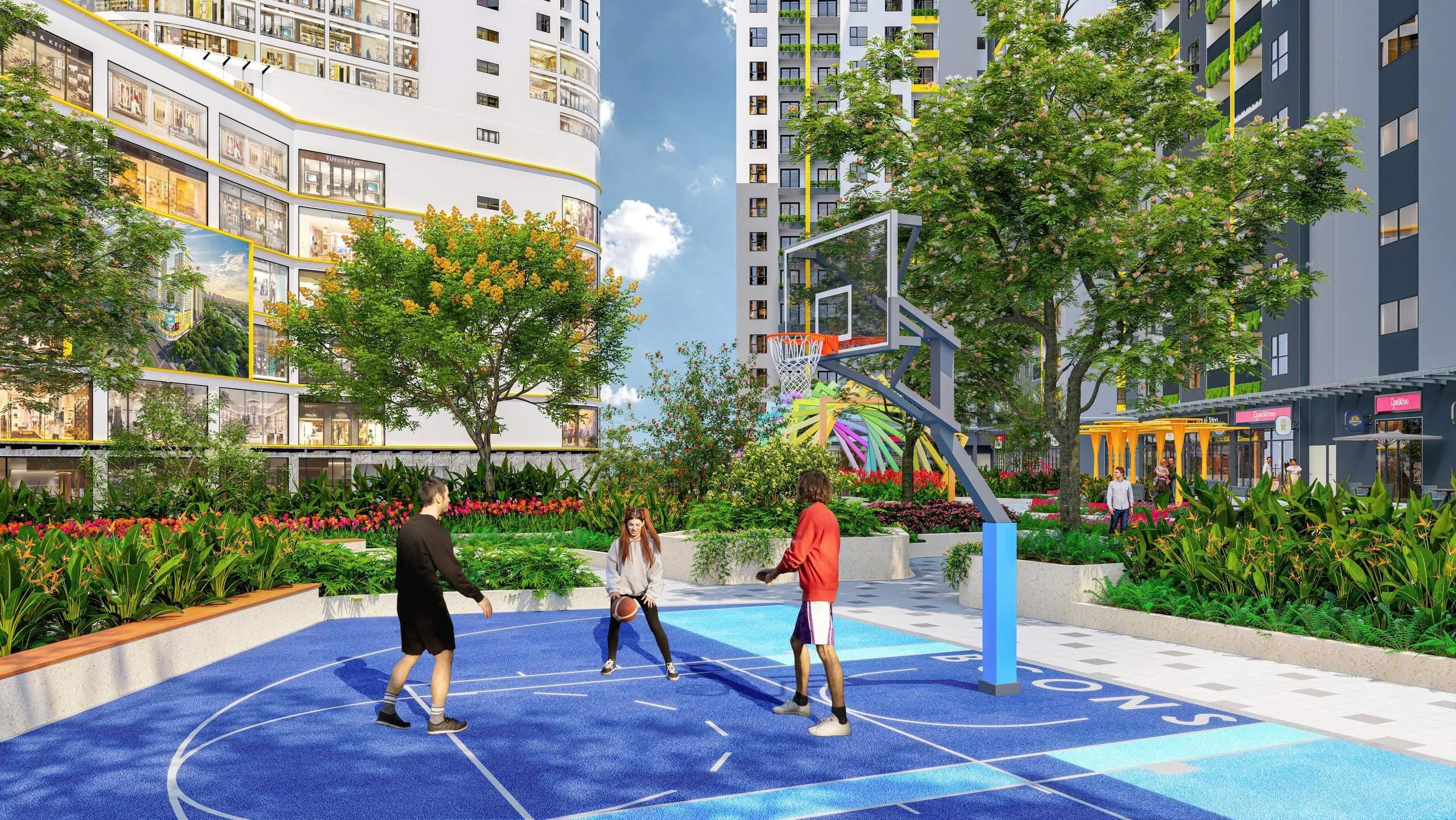 Phối cảnh khu vực tầng 7khu trung tâm thương mại gồm hồ bơi,sân vườn,BBQ
